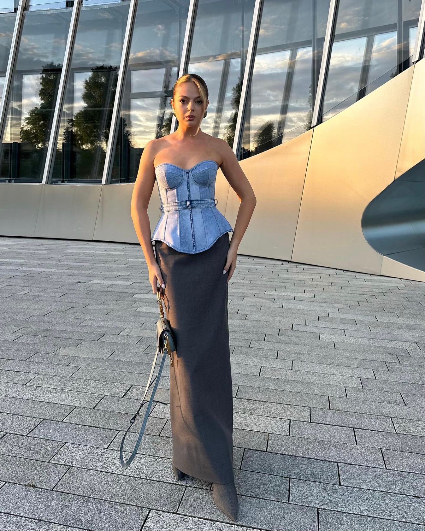Šį korseto modelį formuojame iš džinsų, kuriuos ardome, todėl kiekvienas korsetas yra unikalus ir turi autentiškas džinsines siūles. (Galima rinktis ir vientisą džinso audinį).