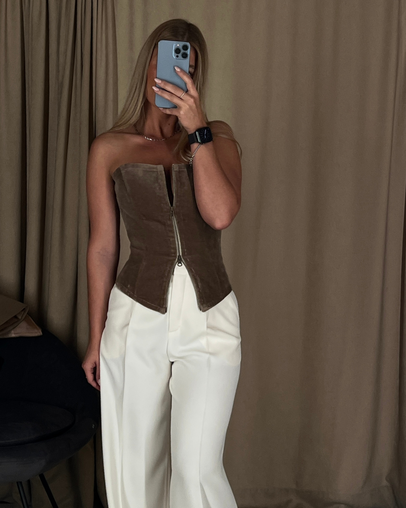 - Ypatybė - užtrauktuką galima atitraukti tiek priekyje, tiek gale, taip sukuriant skirtingus korseto įvaizdžius ir formas